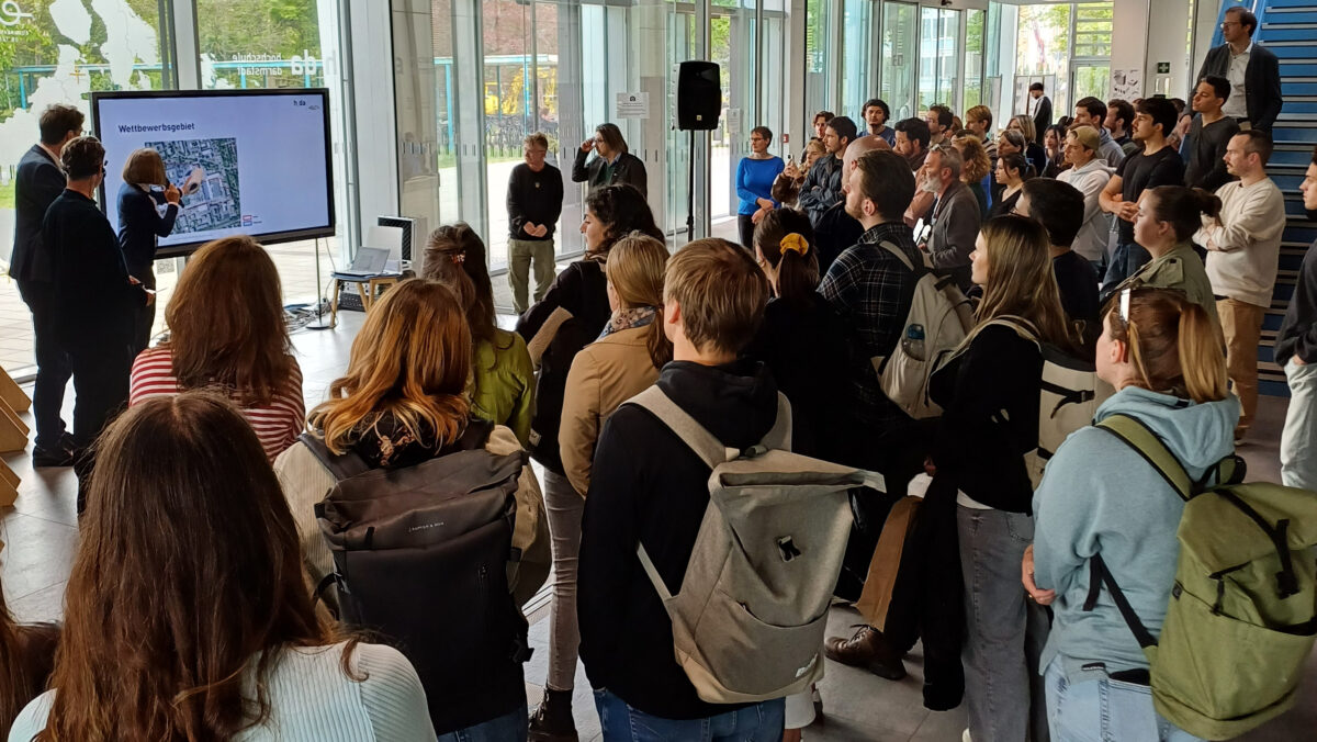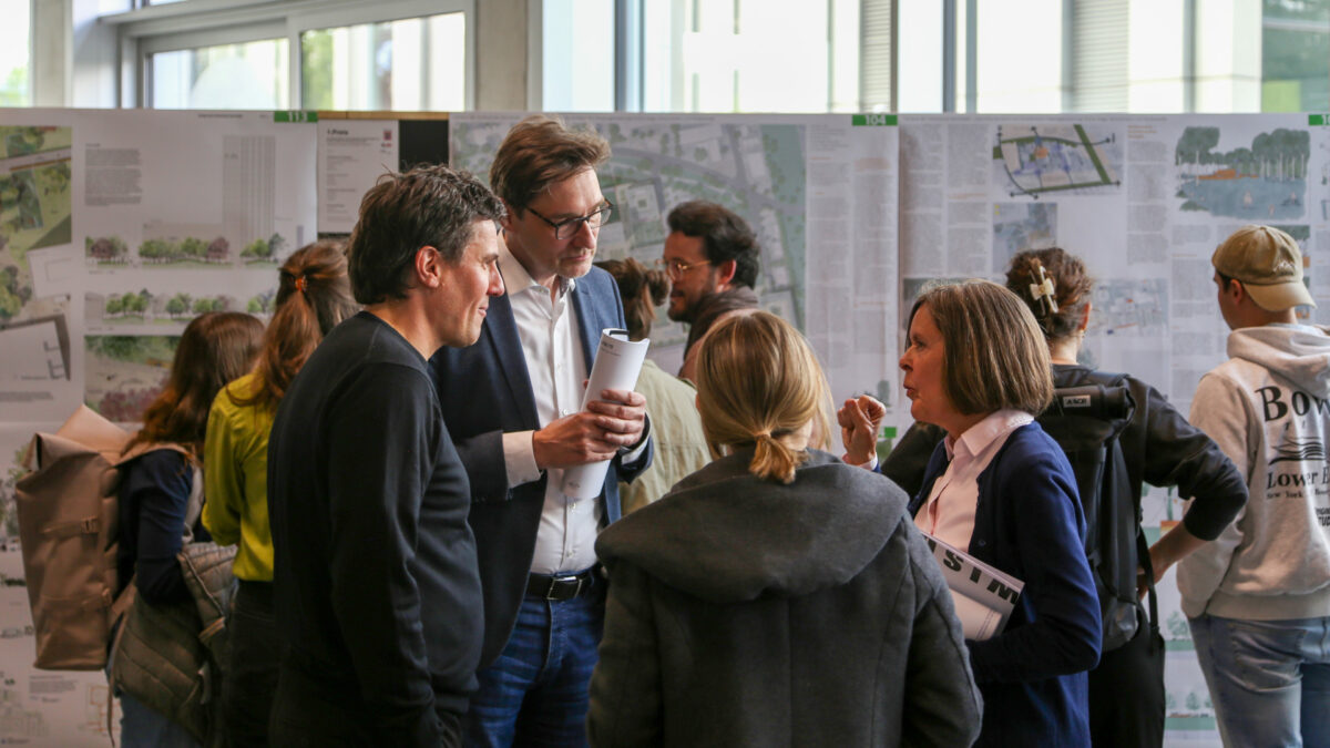Parallel zu unserem Entwurf fand ein offizieller Wettbewerb zur Neugestaltung der Außenanlagen am Campus Schöfferstraße statt. Im April 2025 eröffnet Dr. Thomas Bartnitzki, Kanzler der Hochschule Darmstadt, sowie Vertreterinnen der Abteilung Bau und Liegenschaften und des Nachhaltigkeitsmanagements die Ausstellung mit den Beiträgen der professionellen Landschaftsarchitekturbüros. Wir nutzen die Chance und zeigen in diesem Rahmen auch eine Auswahl unserer studentischen Entwürfe im Foyer des Studierendenhauses.